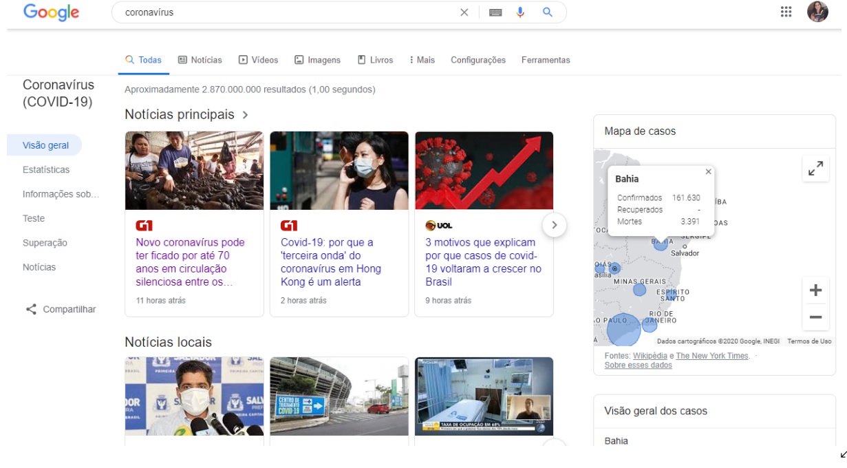 - A página de resultados é praticamente um novo site, incluindo os menus laterais “visão geral”, “estatísticas”, “informações sobre saúde”, “teste”, “superação” e “notícias”. Sem dúvida, eu consigo obter uma boa quantidade de informações sem precisar sair do Google. Isso seria aceitável, não fosse o fato de que a gigante de tecnologia não produziu uma linha daquele conteúdo: tudo vem de outros sites.