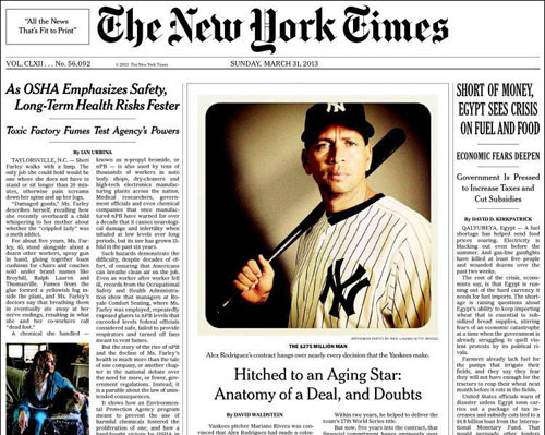 O fotógrafo esportivo Nick Laham, do New York Times, decidiu registrar a foto do jogador de beisebol Alex Rodríguez a partir da câmera de seu iPhone. Depois, editou no Instagram. O resultado foi estampado como foto principal na capa da edição de 31 de março.