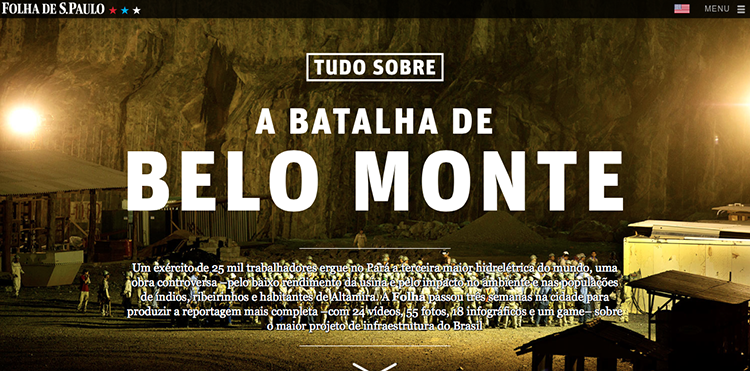 Após dez meses de reportagem, envolvendo cerca de 15 jornalistas, a Folha de S.Paulo lançou neste mês de dezembro a série digital Tudo Sobre. Seguindo o esmagador sucesso de Snowfall, do New York Times, de 2012, a reportagem da Folha exibe por meio de gráficos dinâmicos, vídeos e fotos as diversas facetas da construção da polêmica usina de Belo Monte.