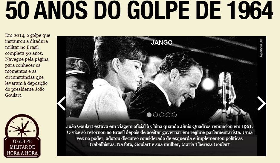 2014 é um ano importante para o Brasil não apenas por causa da eleição presidencial e da realização da Copa do Mundo de Futebol da Fifa. O ano marca os 50 anos da implementação do Regime Militar (1964-1985) no Brasil, com a tomada de comando do país pelos militares através da deposição de João Goulart. Jango, inclusive, está entre os principais personagens do primeiro especial da Folha sobre a data histórica.