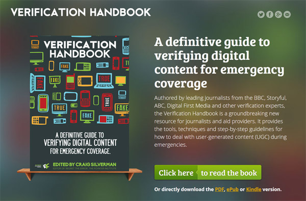 Para auxiliar os jornalistas no processo de verificação das informações geradas por usuários, o European Journalism Centre lançou o Verification Handbook, com dicas de ferramentas e recursos para assessorar a apuração. O manual está dividido em 10 capítulos e conta com diversos estudos de casos.