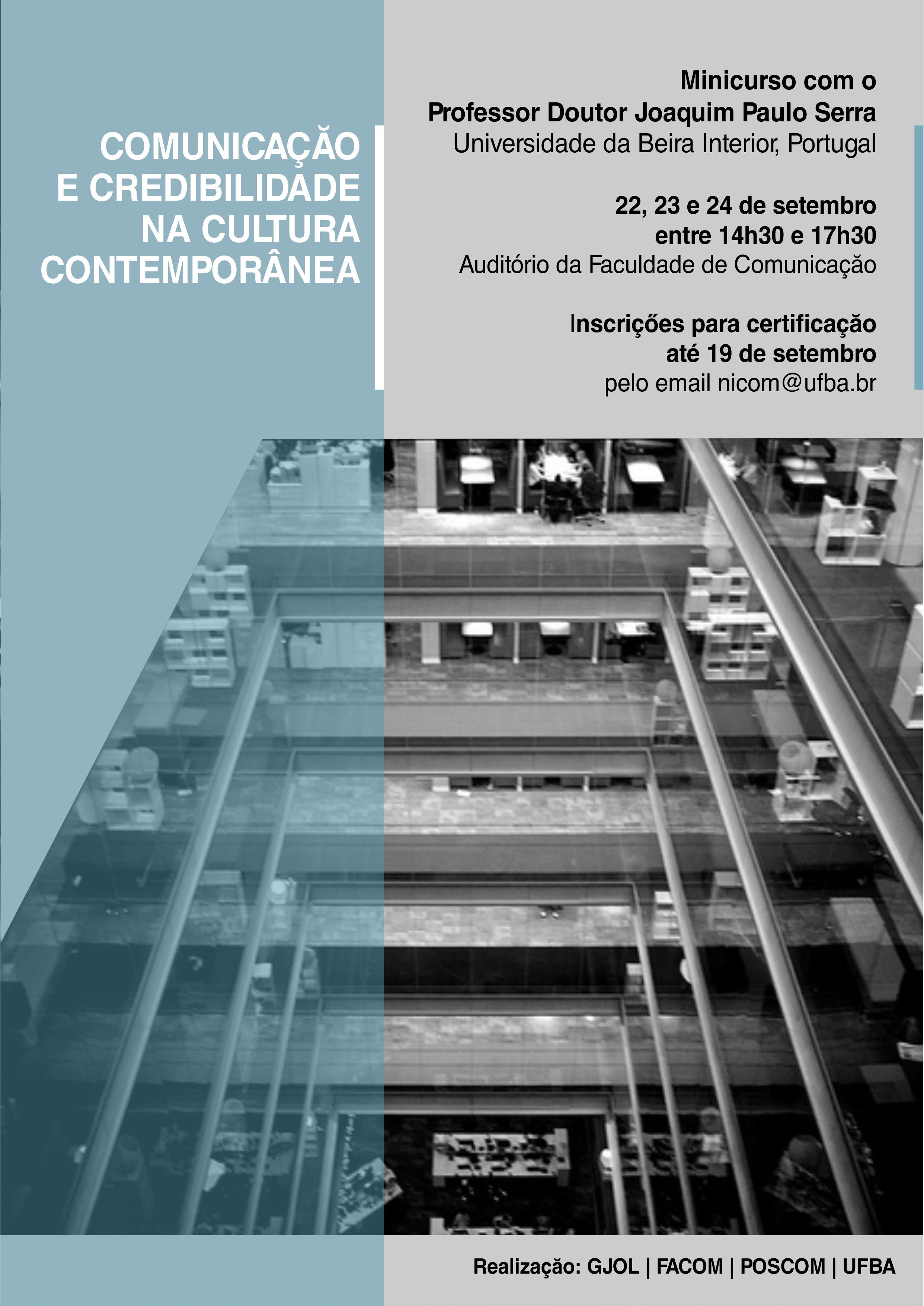 Entre os dias 22 e 24 de setembro, a Faculdade de Comunicação da Universidade Federal da Bahia (FACOM/UFBA) sediará o Minicurso “Comunicação e Credibilidade na Cultura Contemporânea”, ministrado pelo Professor Doutor Joaquim Paulo Serra, presidente da Faculdade de Artes e Letras da Universidade da Beira Interior (UBI, Portugal).