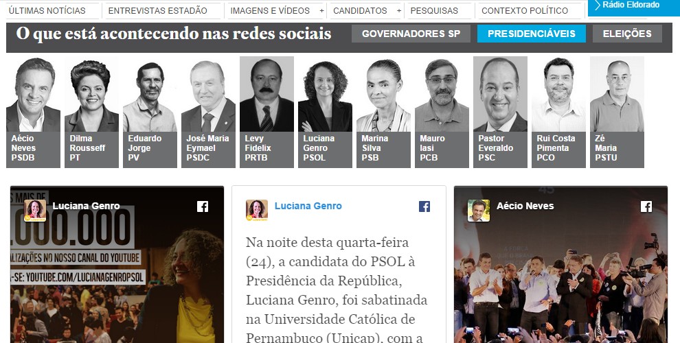 Uma ferramenta do Estadão possibilta que se acompanhe o que está sendo postado por candidatos a Presidente e Governador nas redes sociais. O recurso oferece também acesso a postagens do próprio jornal, com notícias e comentários relativos às eleições.