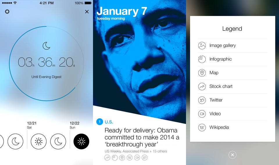 As cores utilizadas no aplicativo demarcam as editoriais. O hard news é classificado por regiões do mundo (Asia-Pacífico, África, Europa, Oriente Médio, por exemplo), além de notícias sobre economia, tecnologia, ciência, cultura e esportes. Cada atualização apresenta 12 histórias.