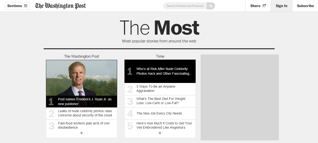 Acrescente-se a essa lista o The Most, um site de agregadores que disponibiliza as mais compartilhadas e as mais lidas de dezenas de sites parceiros, como The Denver Post, The Houston Chronicle, além do Washington Post. O site é patrocinado pela Hyundai.