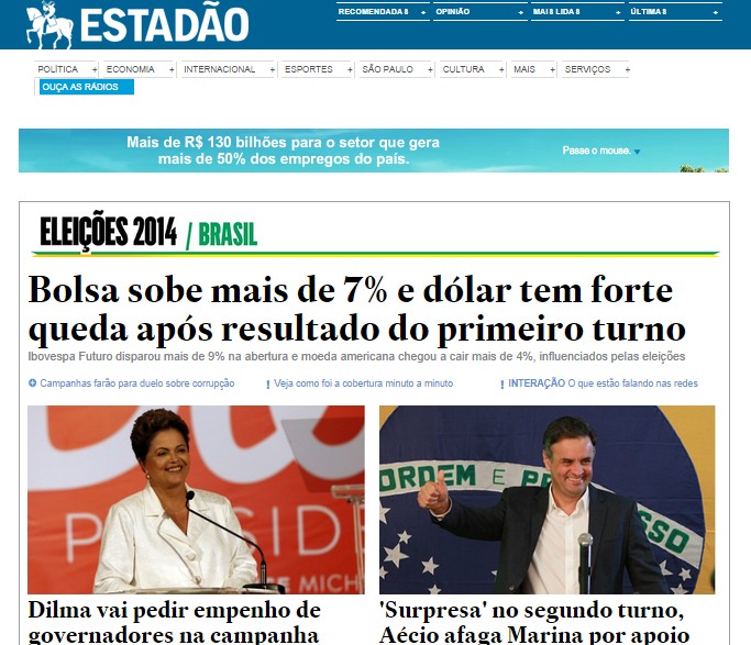 A oposição, representada no primeiro turno por Aécio e Marina como os candidatos com reais chances de confronto com a situação, esteve fortemente apoiada pela quase totalidade da chamada Grande Imprensa.
