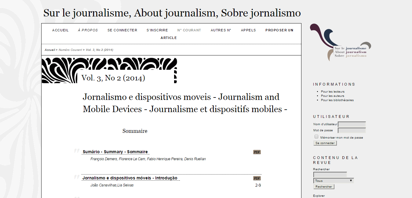 A nova edição da Revista Sur Le Journalisme tem como temática “Jornalismo e Dispositivos Móveis”. O número traz reflexões sobre o conteúdo dos dispositivos móveis como modificador das indústrias de informação, rotinas produtivas, além de traçar um panorama sobre os vespertinos desenvolvidos para as plataformas móveis (autóctones).