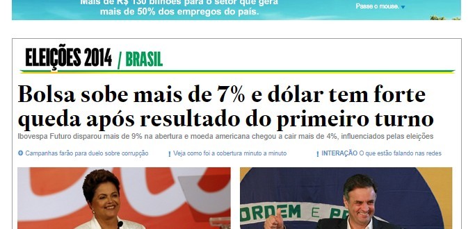 O PT e Dilma Roussef, como sua candidata à Presidência, detém o controle da chamada Máquina Pública. A oposição, representada no primeiro turno por Aécio e Marina como os candidatos com reais chances de confronto com a situação, esteve fortemente apoiada pela quase totalidade da chamada Grande Imprensa. As capas das edições de  Isto é