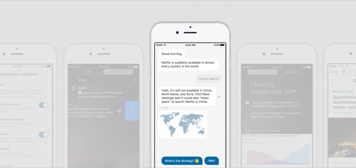 O Quartz lançou novo aplicativo em que o usuário acessa conteúdo como se estivesse conversando com um amigo em um chat. As notícias chegam através de mensagem de texto, em inglês. A cada nova mensagem são apresentadas alternativas para o leitor interagir com o conteúdo. O usuário pode ser encaminhado para o site original e ler